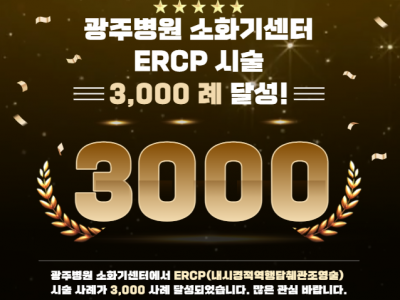 광주병원 소화기센터 ERCP 시술 사례 3,000례 달성!광주병원 소화기센터가 내시경적 역행성 담췌관조영술(ERCP) 3,000례를 달성하며 지역 내 소화기 질환 치료의 중심 의료기관으로서 또 한 번 의미 있는 성과를 이루었습니다.ERCP는 담도 및 췌장 질환의 진단과 치료를 동시에 시행하는 고난도 시술로, 숙련된 의료진의 경험과 정밀한 술기가 요구되는 전문 영역입니다. 광주병원 소화기센터는 풍부한 임상 경험과 체계적인 협진 시스템을 기반으로 담석증, 담도 협착, 췌장염, 담관염 등 다양한 담췌 질환 환자에게 신속하고 안전한 치료를..